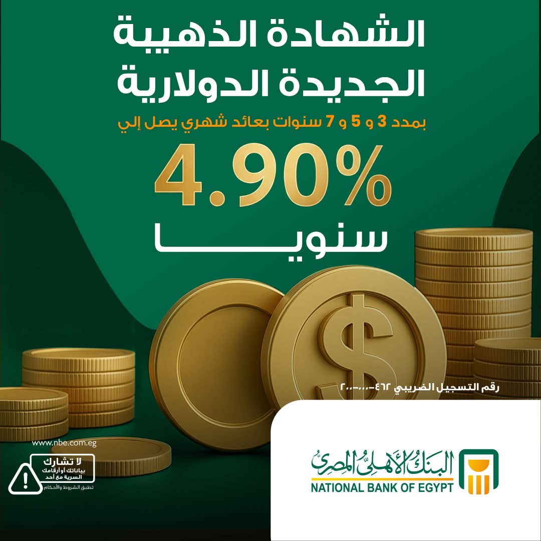 أعلن البنك الأهلي المصري عن طرح الشهادة الذهبية الدولارية الجديدة بمدد متنوعة تشمل 3 و5 و7 سنوات، وذلك بعائد ثابت يصل إلى 4.90% سنويًا يُصرف بشكل شهري، في خطوة تستهدف تقديم حلول ادخارية جاذبة للعملاء الراغبين في الاستثمار بالدولار.