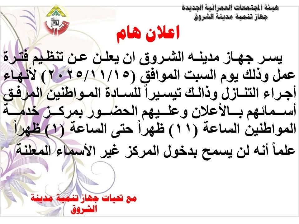 أعلن جهاز تنمية مدينة الشروق أنه سيتم تنظيم فترة عمل يوم السبت الموافق 15 نوفمبر 2025 لإنهاء إجراءات التنازل الخاصة بعدد من المواطنين بمنطقة الربوة، وذلك تيسيرًا للخدمات وإنهاء الإجراءات الإدارية للمستفيدين المدرجة أسماؤهم في الكشوف المرفقة بالإعلان.