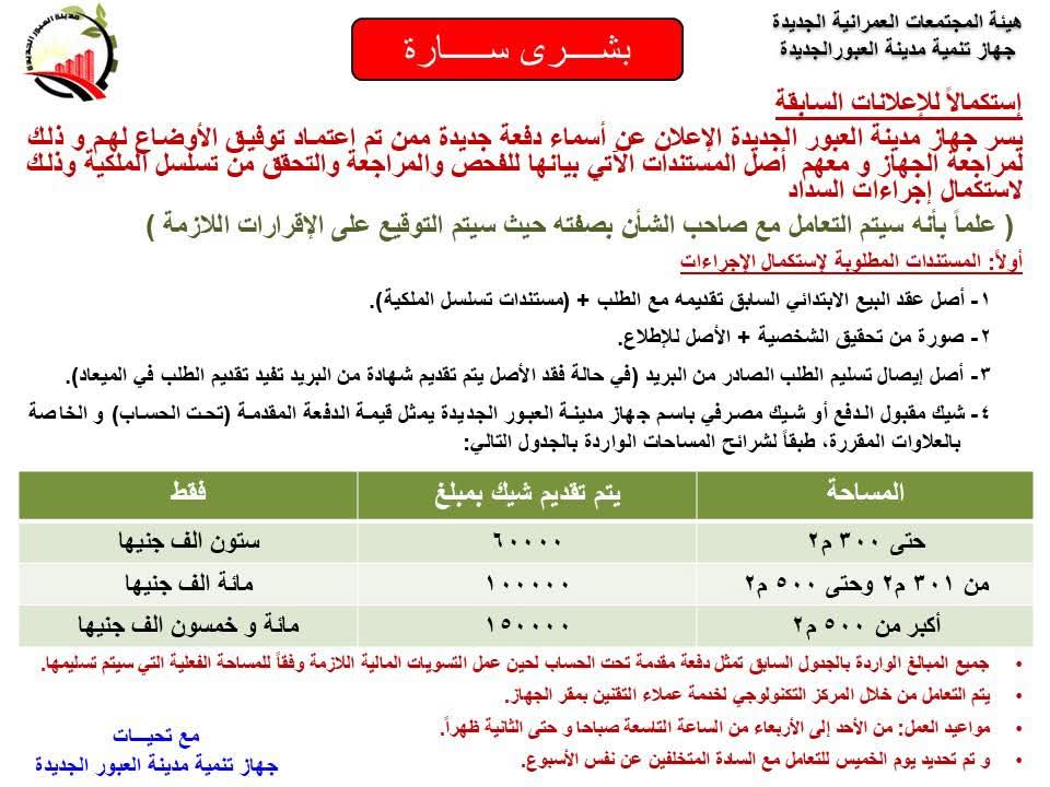 شيك مقبول الدفع أو شيك مصرفي باسم جهاز مدينة العبور الجديدة بقيمة الدفعة المقدمة وفق المساحة المحددة.