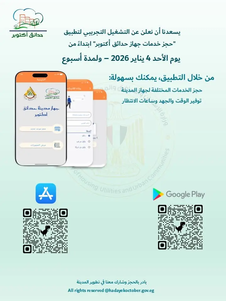 أعلن جهاز مدينة حدائق أكتوبر عن بدء التشغيل التجريبي لتطبيق «حجز خدمات جهاز حدائق أكتوبر»، وذلك اعتبارًا من يوم الأحد 4 يناير 2026 ولمدة أسبوع، تمهيدًا لبدء التشغيل الفعلي للتطبيق.