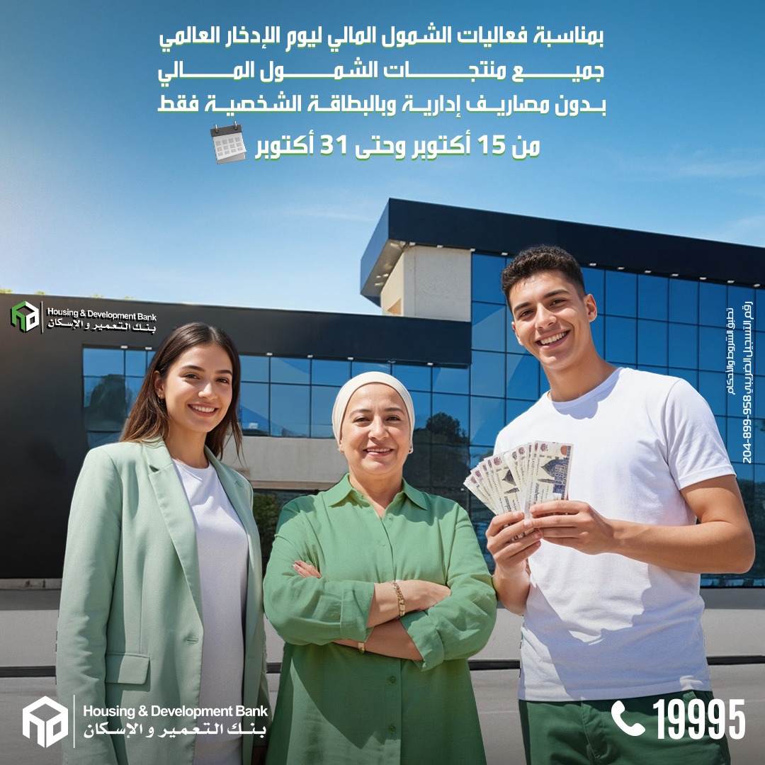 في إطار فعاليات الشمول المالي ليوم الادخار العالمي، التي تُقام تحت رعاية البنك المركزي المصري خلال الفترة من 15 إلى 31 أكتوبر 2025، أعلن بنك التعمير والإسكان عن مشاركته في المبادرة من خلال إتاحة جميع منتجات الشمول المالي بدون أي مصاريف إدارية، مع إمكانية التقديم باستخدام البطاقة الشخصية فقط، دعمًا لجهود الدولة والبنك المركزي في تعزيز الشمول المالي ونشر ثقافة الادخار بين المواطنين.