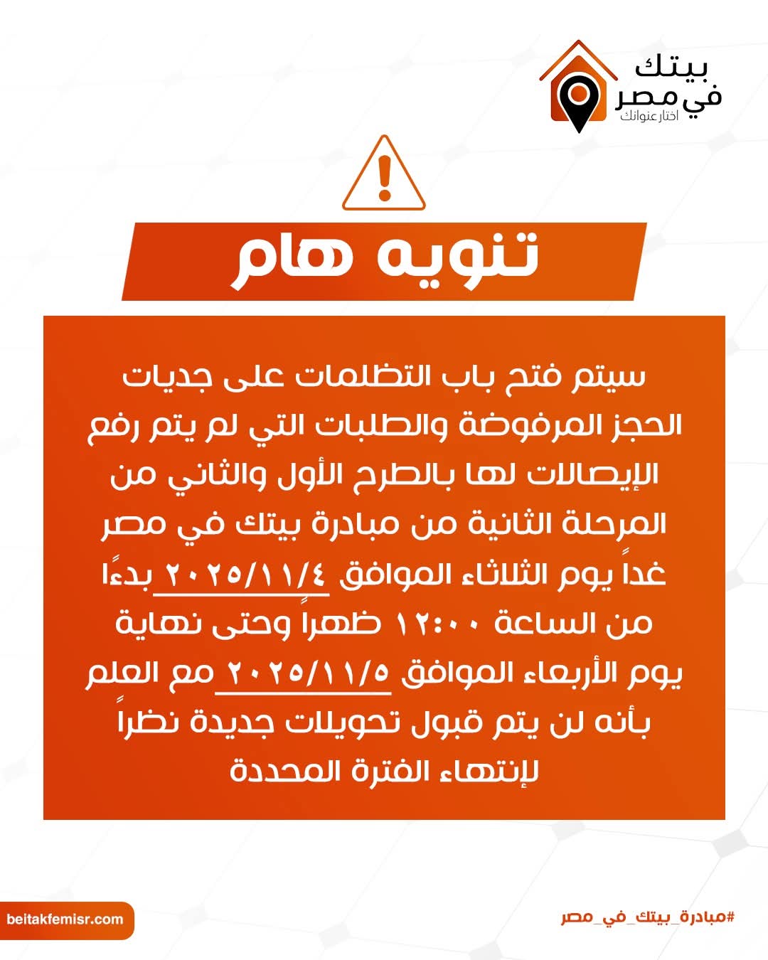 أعلنت مبادرة “بيتك في مصر” عن فتح باب التظلمات على جديات الحجز المرفوضة والطلبات التي لم يتم رفع إيصالات لها ضمن الطرحين الأول والثاني من المرحلة الثانية للمبادرة، وذلك اعتبارًا من يوم الثلاثاء 4 نوفمبر 2025.