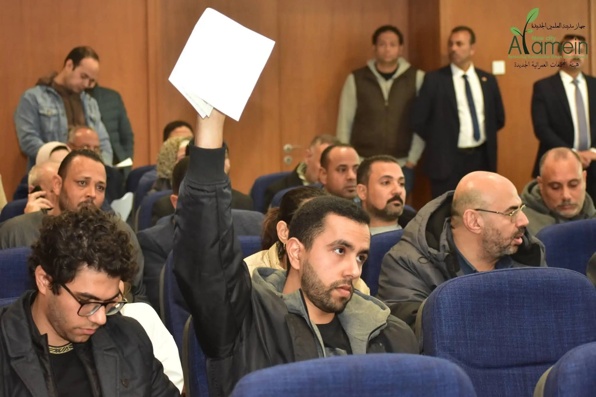 وقد عُقدت جلسة المزاد بحضور الدكتور مهندس محمد خلف الله رئيس جهاز مدينة العلمين الجديدة والمشرف على جهاز القرى السياحية، والمستشار محمد سليمان مستشار مجلس الدولة، و أ.د محاسب دكتور شريف الجندي بالقطاع العقاري بالهيئة، وا.وائل عبد الغني بالقطاع المالي بالهيئة، وا.محمد أبو خليل مندوب وزارة المالية، والمحاسب شريف دراج نائب رئيس الجهاز للشئون المالية والمشرف على الإدارة العقارية، والمهندسة هند علي نائب رئيس الجهاز للمشروعات،وم.عبدالعزيز سليمان نائب رئيس الجهاز و ا.إبراهيم فتحي مدير عام الإدارة القانونية، والعميد احمد شهبه مدير ادارة الامن بالجهاز والعقيد هيثم اسامه رئيس قسم شرطة التعمير بالعلمين الجديدة إلى جانب أعضاء اللجنة المختصة.