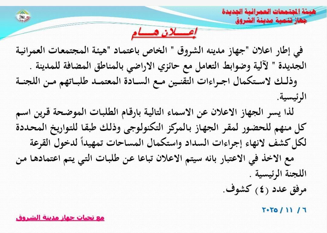 أعلن جهاز تنمية مدينة الشروق التابع لهيئة المجتمعات العمرانية الجديدة، عن قوائم جديدة من أسماء المواطنين الذين تم اعتماد طلباتهم من اللجنة الرئيسية، ضمن آلية وضوابط التعامل مع حائزي الأراضي بالمناطق المضافة للمدينة.