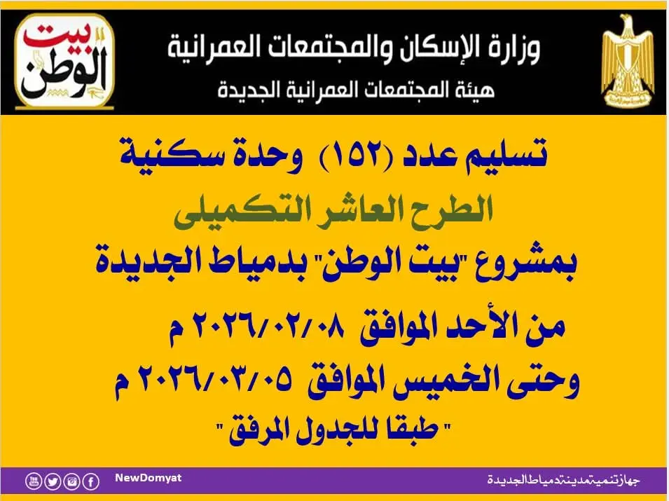 أعلن جهاز تنمية مدينة دمياط الجديدة عن بدء تسليم وحدات الطرح العاشر التكميلي ضمن مشروع بيت الوطن، وذلك في إطار خطة الدولة لتوفير وحدات سكنية متنوعة تلبي احتياجات المواطنين وتعزز التنمية العمرانية بالمدينة.
