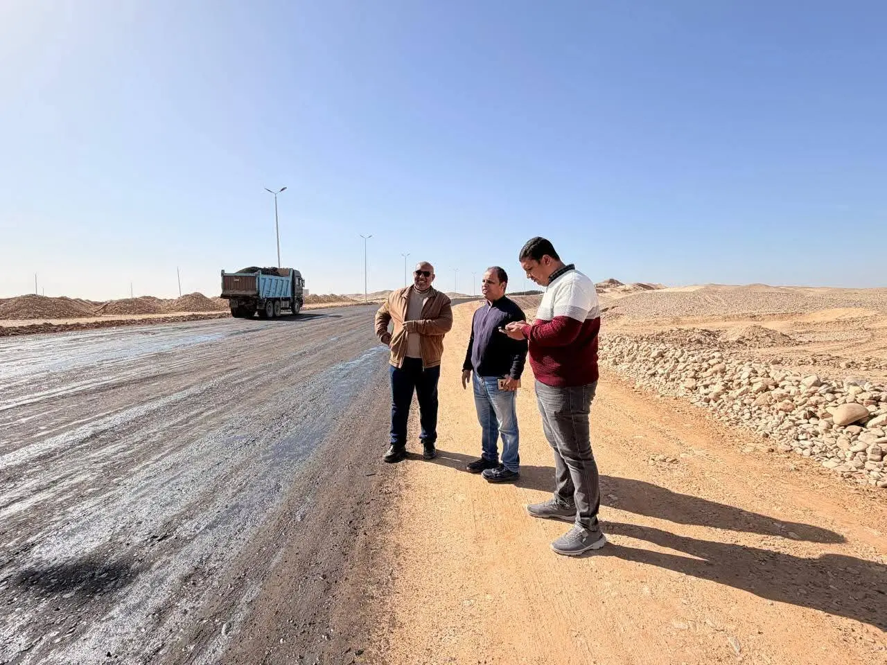 وتضمنت الجولة تفقد الطريق الرئيسي M1_1 الذي يمثل المحور الحيوي بالمنطقة، حيث تم متابعة أعمال طبقة الأساس وأعمال التشريب وبدء تنفيذ الطبقة الرابطة الأسفلتية، والتي تنفذها شركة محمد كمال كامل للمقاولات، وسط التزام واضح بالمواصفات الفنية والبرنامج الزمني المعتمد.