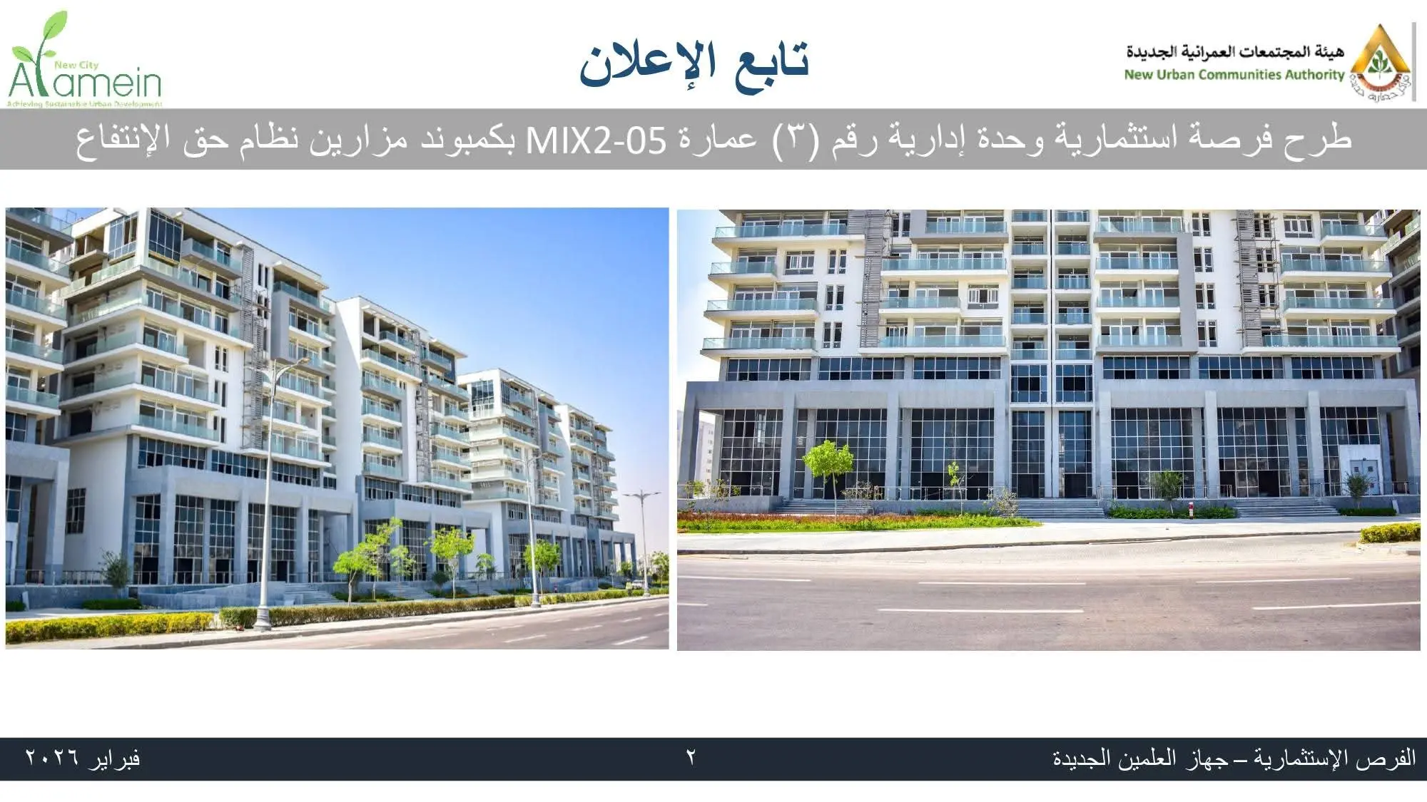 وأضاف أن الطرح يتمثل في وحدة إدارية بعمارة رقم (3) بمجمع MIX2-05 داخل الكمبوند، ويتم التخصيص وفق نظام حق الانتفاع، بما يضمن أعلى جودة تشغيل وتحقيق أفضل استفادة من الموقع.