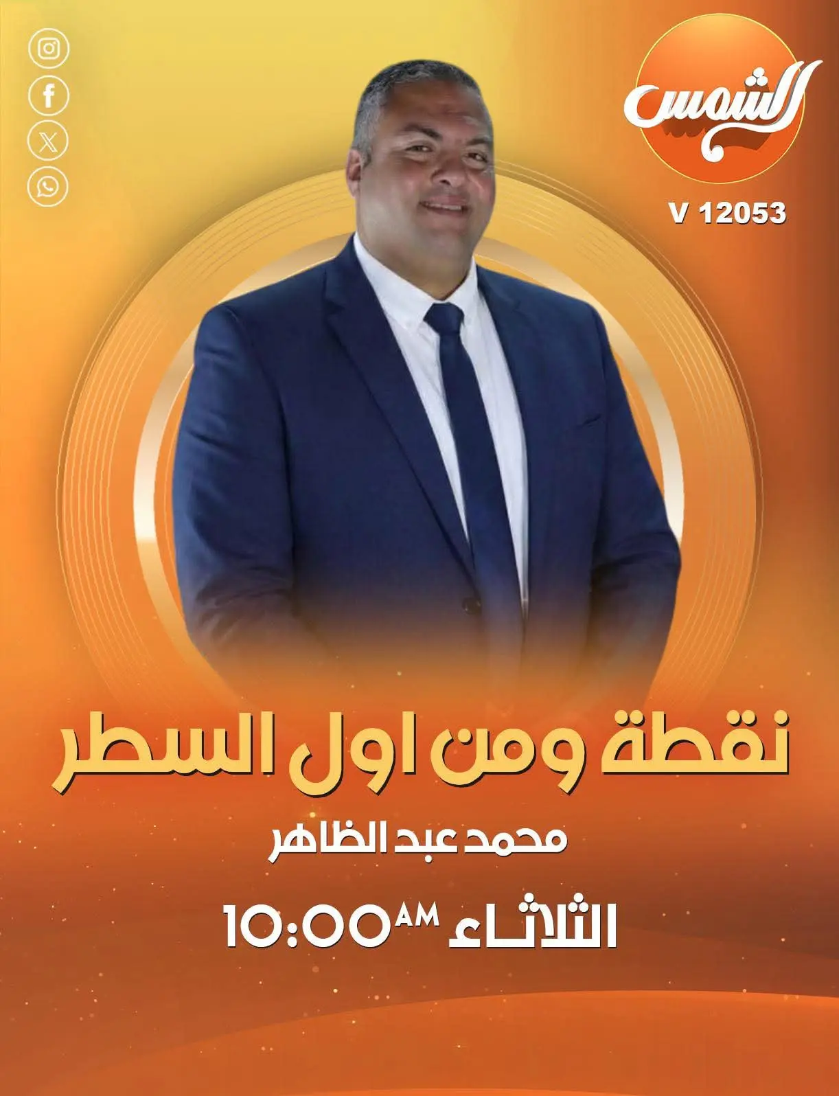 ينطلق برنامج «نقطة ومن أول السطر» في عرضٍ دوري كل يوم ثلاثاء في تمام الساعة العاشرة صباحًا على شاشة قناة الشمس، ليقدم محتوى إعلاميًا يناقش الملفات المهمة والقضايا التي تمس الواقع بوضوح وجرأة، من خلال حلقات متجددة تضع الحقيقة في صدارة الاهتمام.